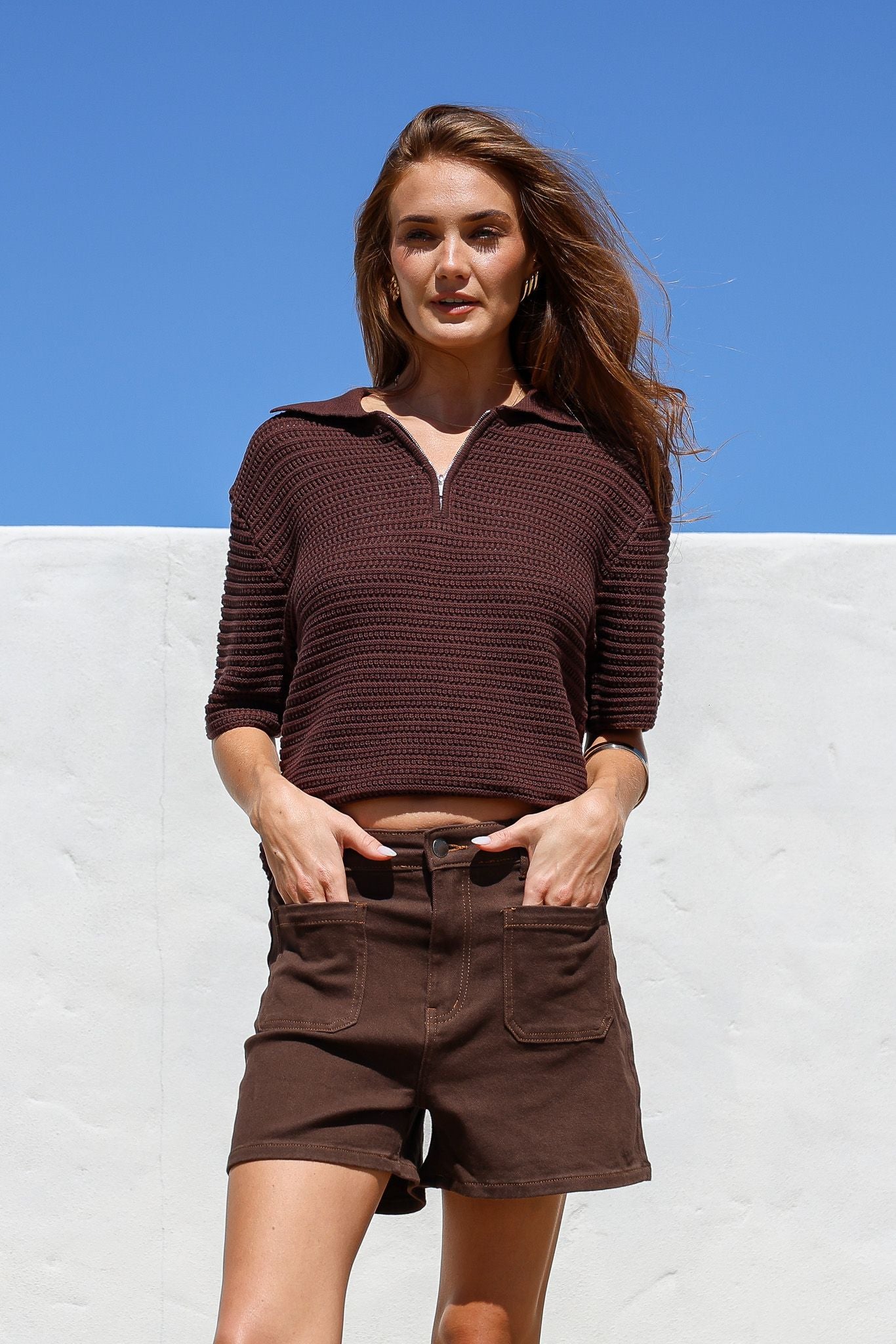 Say hello to your new go to shorts. In a rich chocolate hue, these soft and stretchy denim shorts are as comfy as they are cool. The flattering mid rise fit hugs in all the right places.