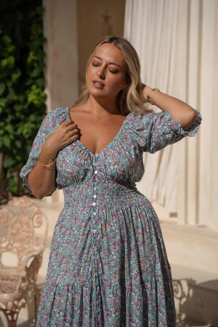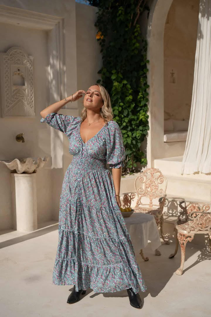 Our best selling Fortune Teller Maxidress by Eclectic Bohemian returns but in a short sleeve version for Spring/ Summer, in the new Meadow print! This magical Gypsy style Maxidress is an absolute dream boat! Balloon sleeves to elbow length, low v-neck with elasticated neckline to allow the shoulders to be worn on or off. Made from our usual soft rayon fabric, in beautiful dainty floral print, with dusty blue background and tiny meadow flowers in hot and pastel pinks and a touch of peach. Buttons all the way down the front, that can unbutton completely if you'd like to wear it as a kimono/duster. There is a soft shirred wide elastic waistband, with 3 tiers in the full style skirt with ladder lace trim. Can be worn as maternity dress due to wide elastic and perfect for breast feeding with the elasticated neckline