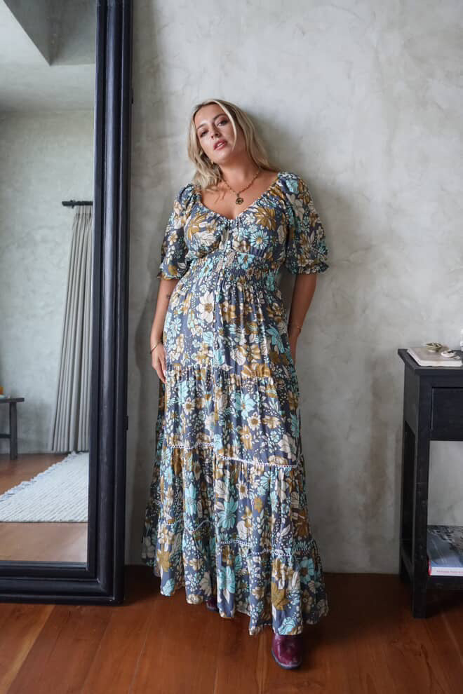 Our best selling Fortune Teller Maxidress by Eclectic Bohemian returns but in a short sleeve version for Spring/Summer, in the new Misty Blue! This magical Gypsy style Maxidress is an absolute dream boat! Balloon sleeves to elbow length, low v-neck with elasticated neckline to allow the shoulders to be worn on or off. Made from our usual soft rayon fabric, in beautiful floral print, with steel grey background and a retro vibe floral in light blue, beige and bronze tones. Buttons all the way down the front, that can unbutton completely if you’d like to wear it as a kimono/duster. There is a soft shirred wide elastic waistband, with 3 tiers in the full style skirt with ladder lace trim. Can be worn as maternity dress due to wide elastic and perfect for breast feeding with the elasticated neckline🌸