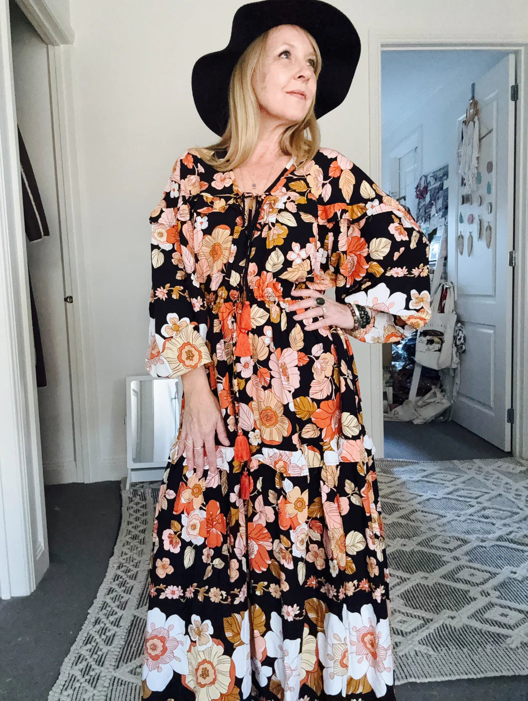 We have brought back our popular Goddess Gown style by Eclectic Bohemian, in the new bold Coral Night print! The Goddess gown has a romantic feel, with a voluminous flowing skirt and loose balloon sleeves! Super swishy full skirt, a v- neckline with a single tie and a small frill around the body under shoulder height. The tie can be left undone for a deeper v-neck. Made with digitally printed super soft rayon fabric, which has a black background with peach, terracotta & beige tone floral prints The balloon sleeves batwing out from the waistline, to create plenty of volume. There is a thin elastic waistband, with a drawstring, so you can adjust how much you want the waist cinched in. There is a tassel tie at the neckline and waist. She also has pockets! 🌸