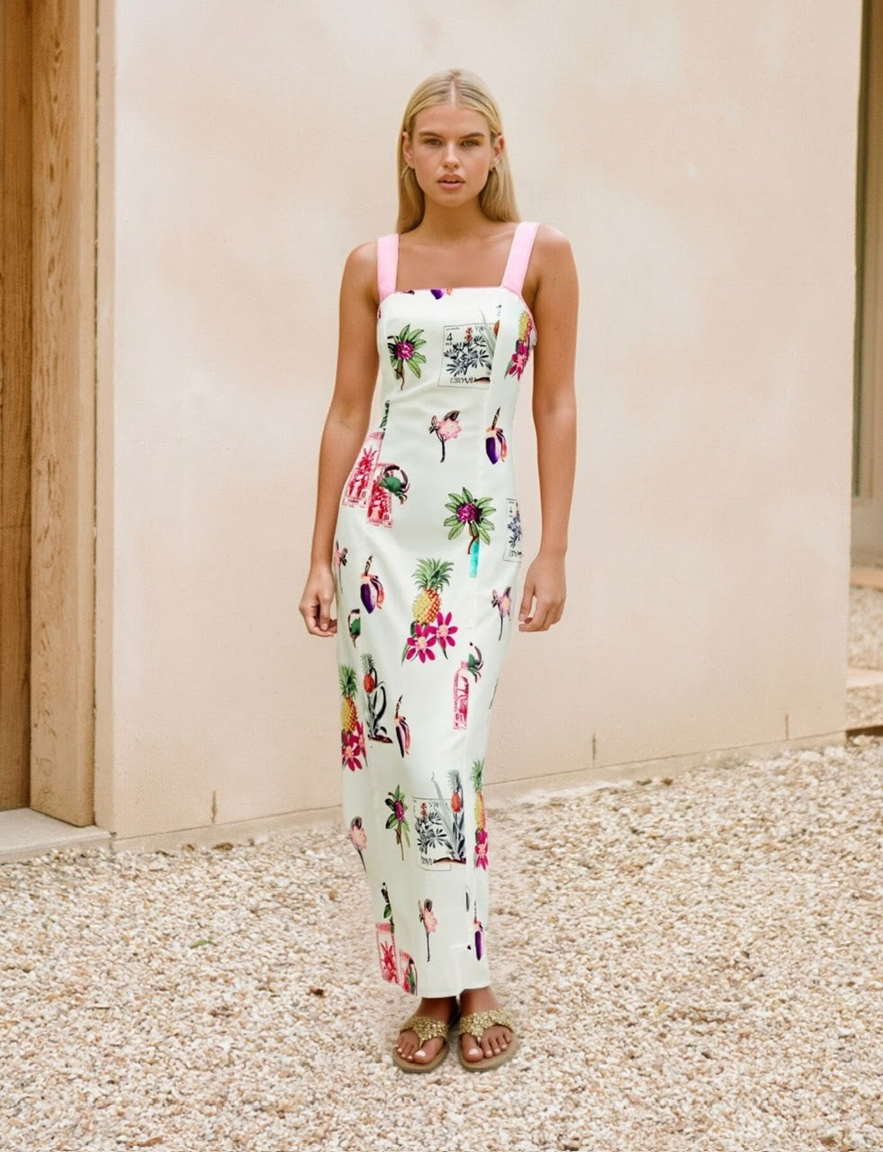 Linen-blend maxi dress in a fresh ivory base with playful pink accents