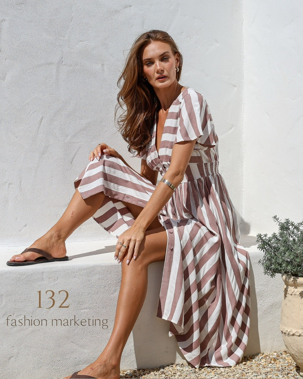 Stripe button front midi dress in Mocha /white Grace and Co.