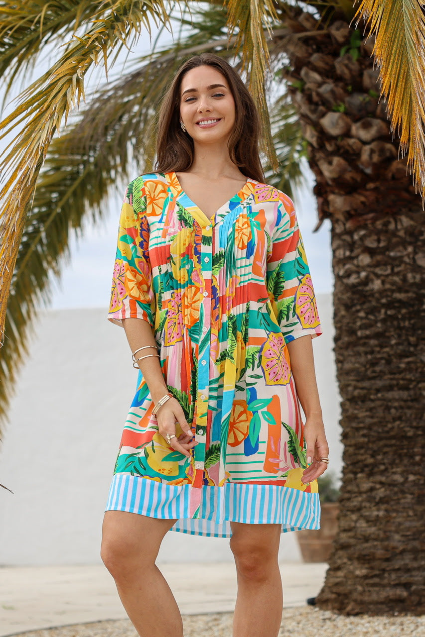 Ravello Spritz Stripe Trim Pleat Detail Button Dress in Turquoise / Multi Coloured.