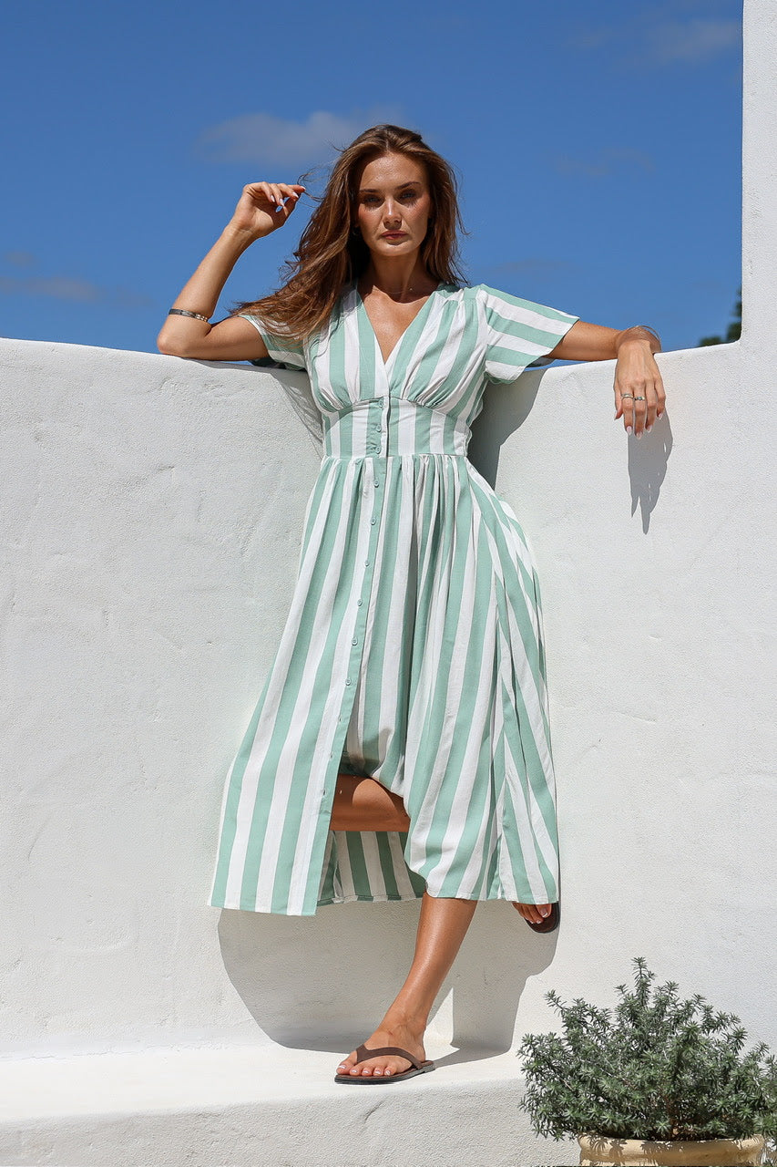Stripe button front midi dress in sage/white Grace and Co.