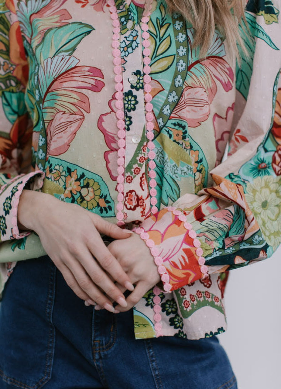 Tropezena dobbie shell button blouse with lace trim in pink/green by Joop and Gypsy.